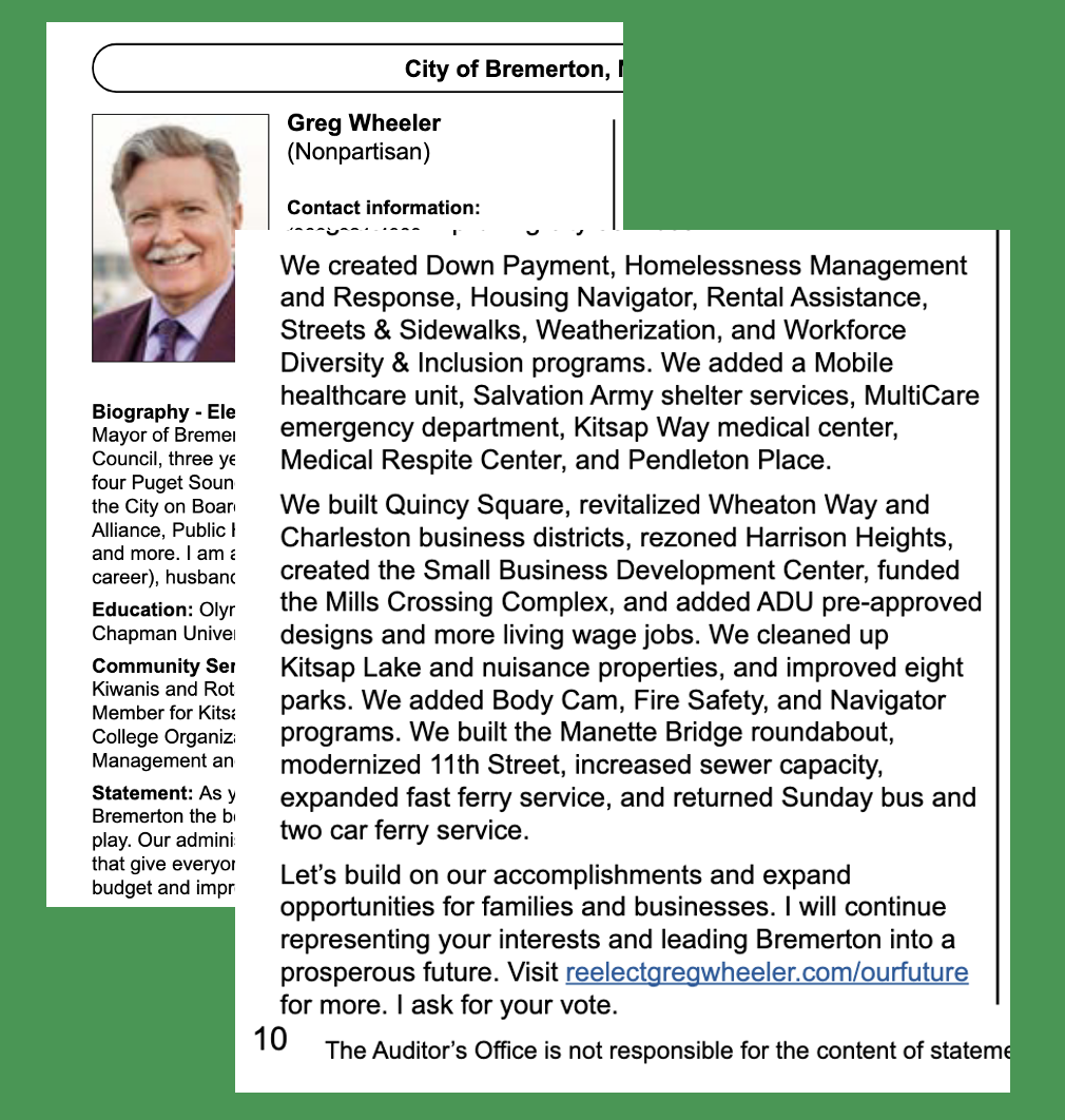 Mr. Wheeler’s official Kitsap County Electdions ‘Pamphlet Statement’ reads like a history chapter. Every verb is in the past tense. ‘Created’, ‘added’, ‘built’, ‘rezoned’, ‘cleaned’.