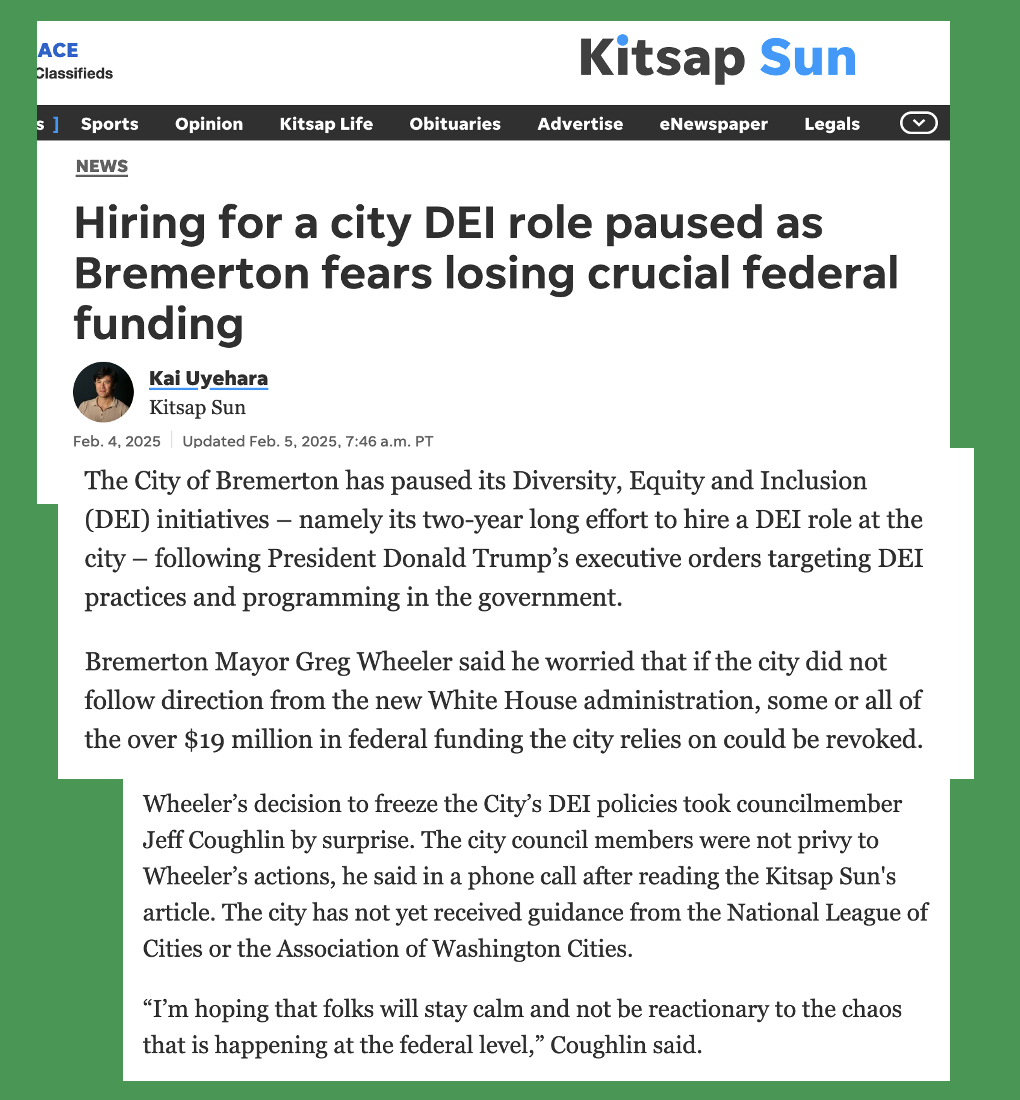 Bremerton upholds its values with its Diversity and anti-descrimination programs. But a vague threat from President Trump made Mr. Wheeler’s bend the knee.