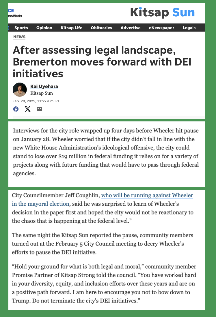 Mayor Wheeler is out of step with Bremerton on diversity and on standing up the Federal Government.